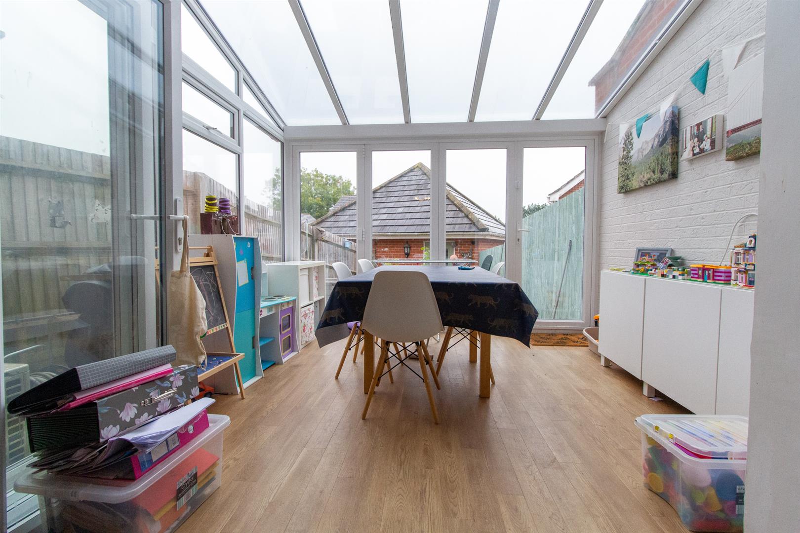 The ground floor includes an open plan reception room with a glazed conservatory, flooding the space with natural light. There are ‘French’ doors opening on to the garden towards to the garage.