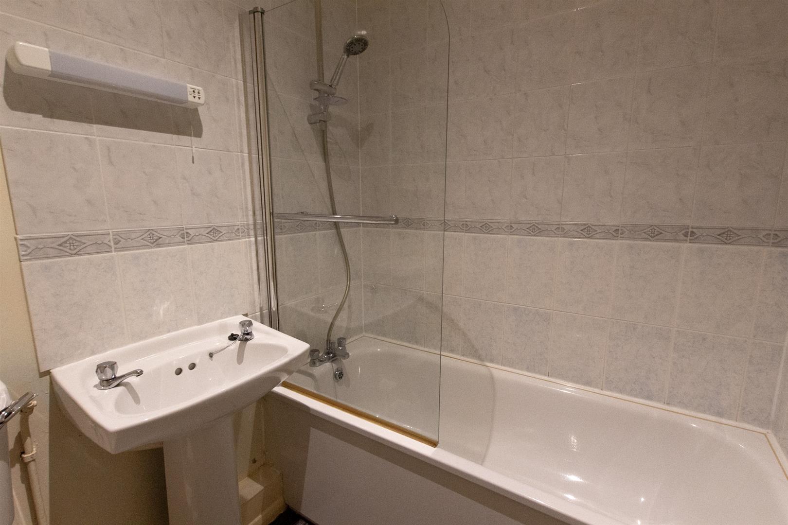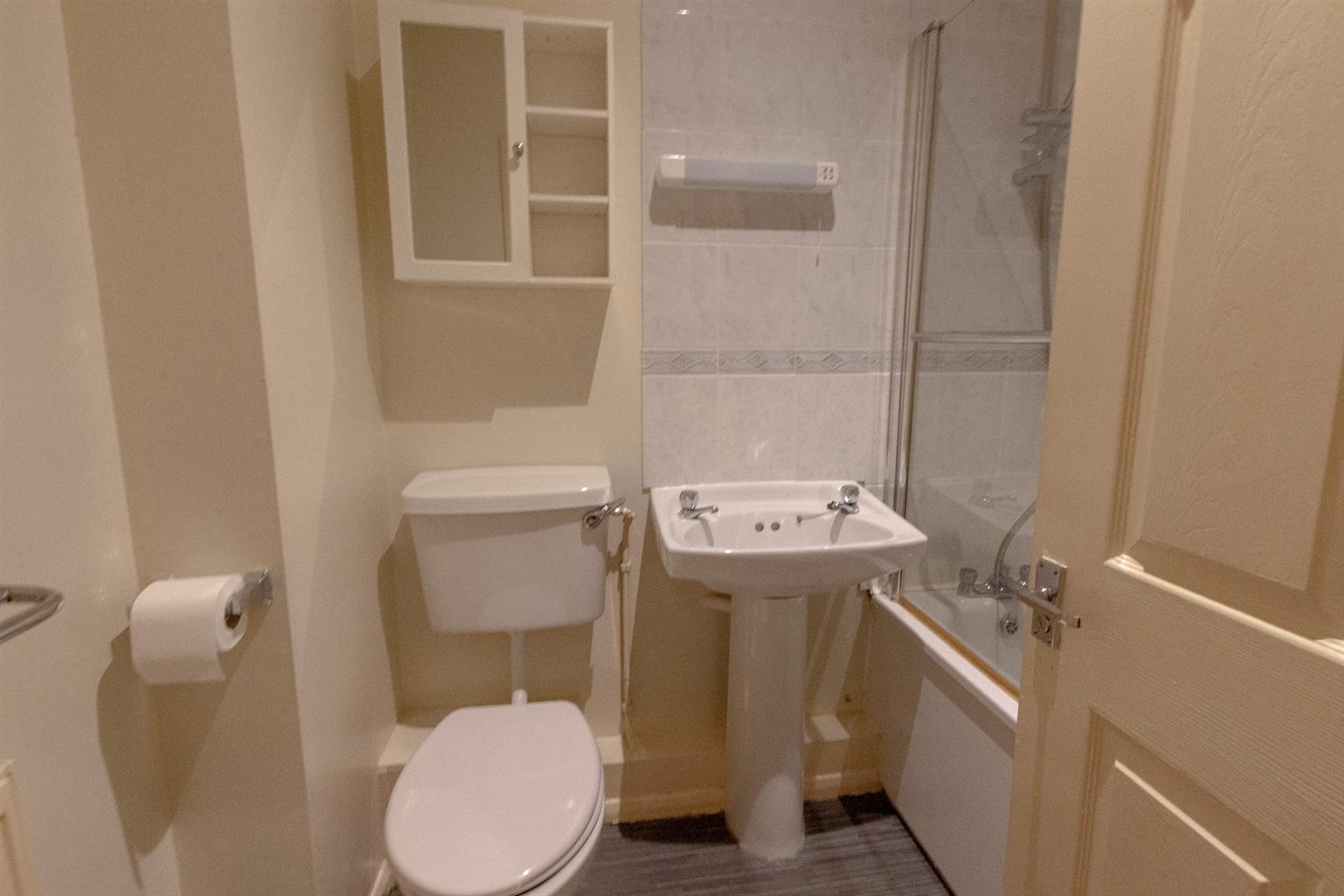 Suite comprising panelled bath with shower attachment, low level WC and wash hand basin. Radiator. Extractor fan.