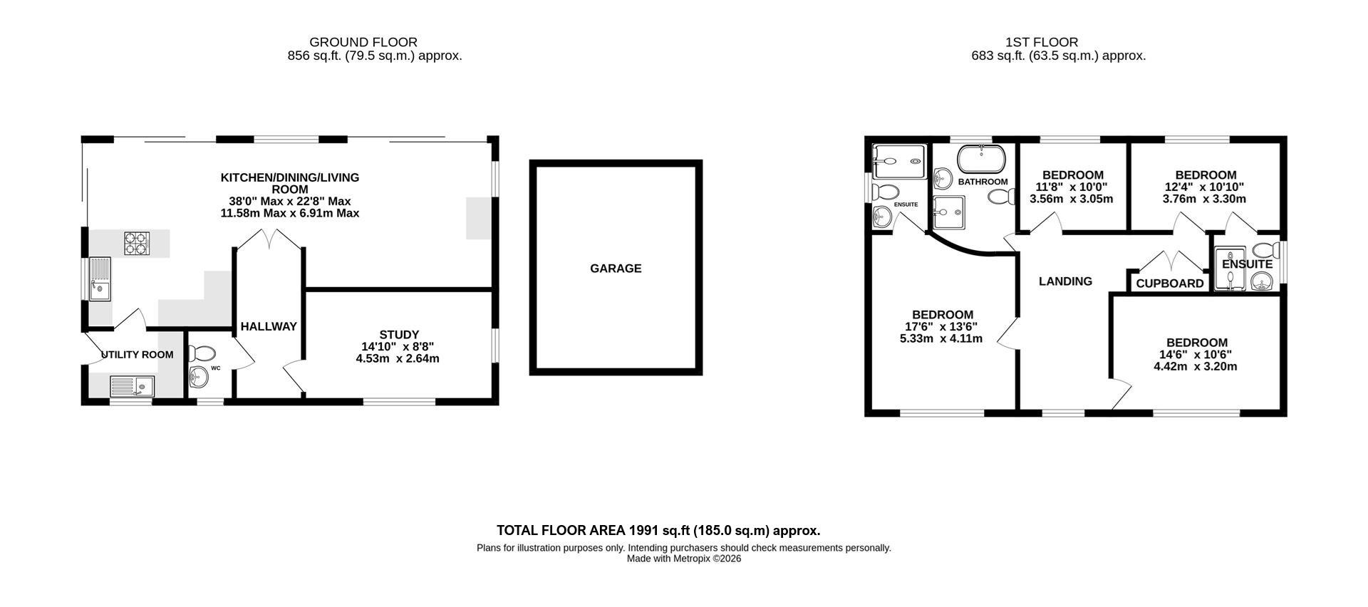 To the rear, a secluded west-facing landscaped garden features lawned areas and a paved patio with established beds and borders. It’s an ideal space for entertaining and dining outdoors.